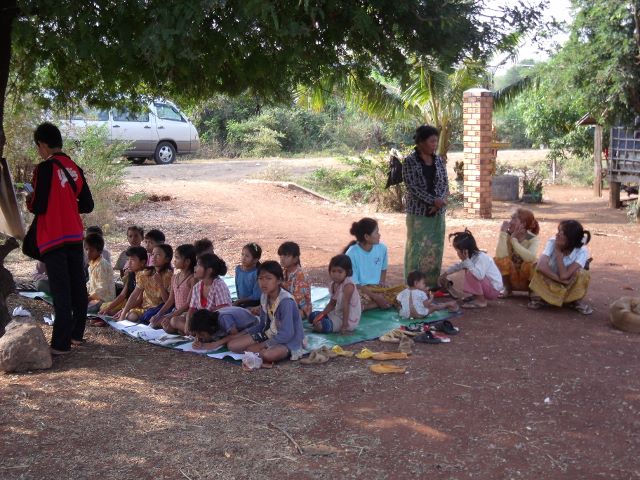 At last things seem to be moving at Dailo – a large village about 5 miles from Svay Sisophon. Father Rajat has been working with the villagers here for several years, building contacts with families and trying to improve the basic facilities. The village is very spread out with the traditional-style houses dotted around in jungle clearings and access down a dirt road only suitable for pickup, bike or ox cart. Up to now, there’s been no water supply here and no community building for people to gather in. Students from the church at Sisophon hold classes in English, Maths & Science for the village children here at weekends and a regular rice soup meal is also provided by the church.